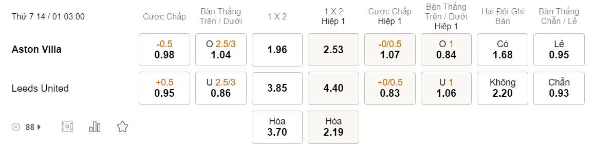Soi kèo châu Á Aston Villa vs Leeds: 0.98*0.5*0.95