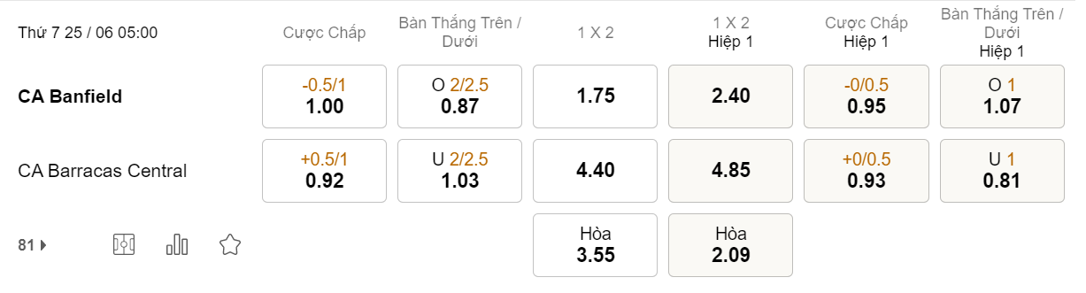 Tỉ lệ kèo Banfield vs Barracas Central