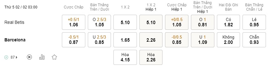 Soi kèo châu Á Betis vs Barcelona: 1.06*0.5/1*0.87