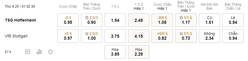 Tỉ lệ kèo Hoffenheim vs Stuttgart