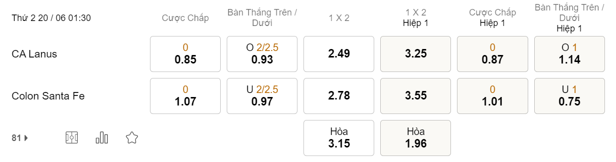 Tỉ lệ kèo Lanus vs Colon