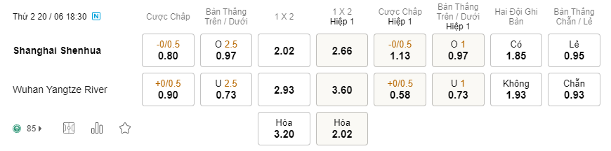 Soi kèo hiệp 1 Shanghai Shenhua vs Wuhan: 1.13*0/0.5*0.58