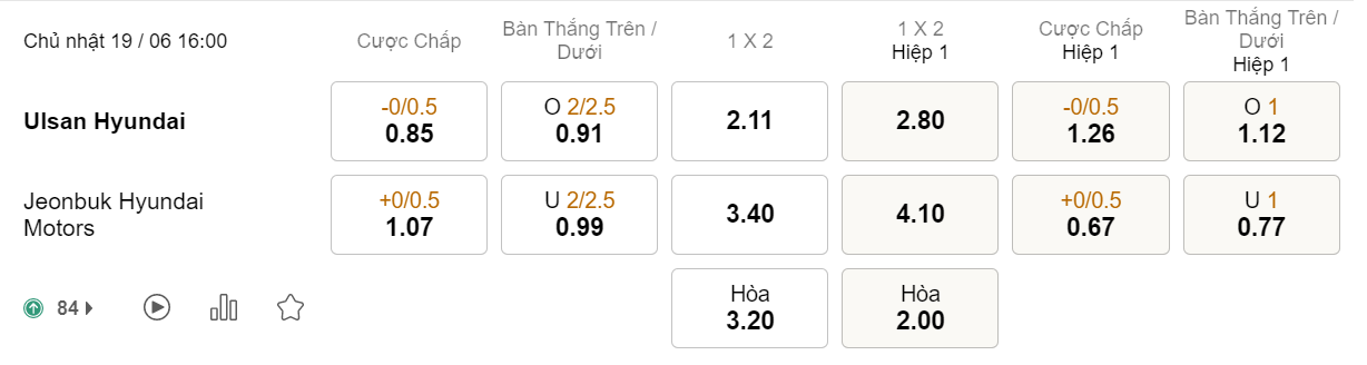 Soi kèo hiệp 1 Ulsan vs Jeonbuk: 1.26*0/0.5*0.67