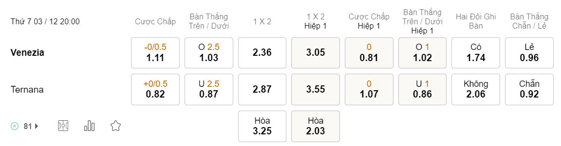 Soi kèo hiệp 1 Venezia vs Ternana: 0.81*0*1.07