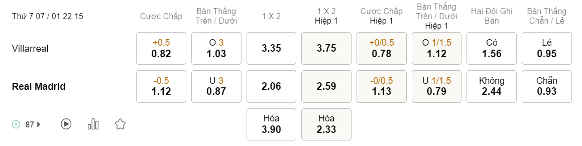 Soi kèo hiệp 1 Villarreal vs Real Madrid: 0.78*0/0.5*1.13